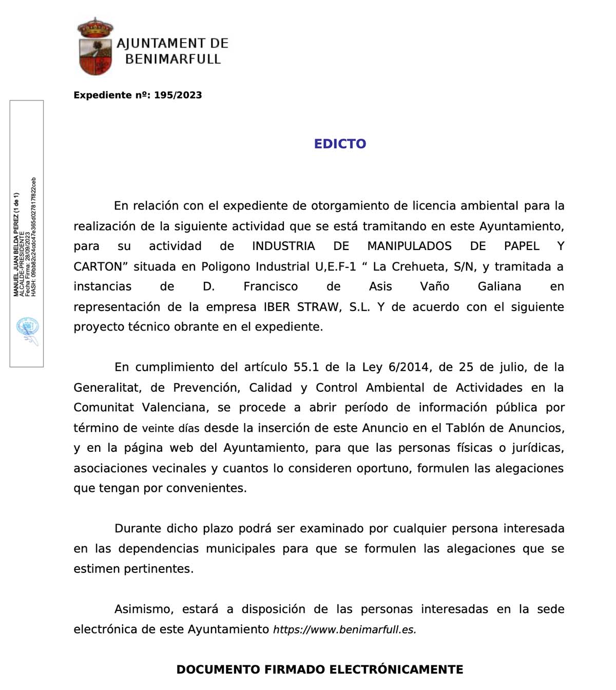 Conforme a proyecto redactado por el ingeniero técnico industrial D. Anselmo Martí (colegiado núm. 2460)