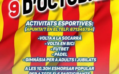 🌟 9 D'OCTUBRE 🥳 Per al dia de la nostra Comunitat, hem preparat una sèrie d'activitats, podrem gaudir de: - Volta a la Socarrà 🚶🏼♀️ - Volta en Bici 🚵🏻 - Futbet ⚽ - Pàdel 🥎 - Gimnàstica per adults i jubilats 🏋🏾 Totes les activitats tindran inici a les 8:30 H el dia 9...